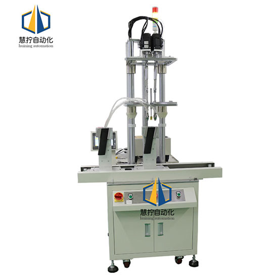 - 左右位移式是在固定的臺面上設計一個可以左右移動的平臺,平臺上設計多個工位,員工在其中一個工位上放置產品時,設備擰其他工位上已經放置好的產品,一邊打螺絲,一邊取放產品。